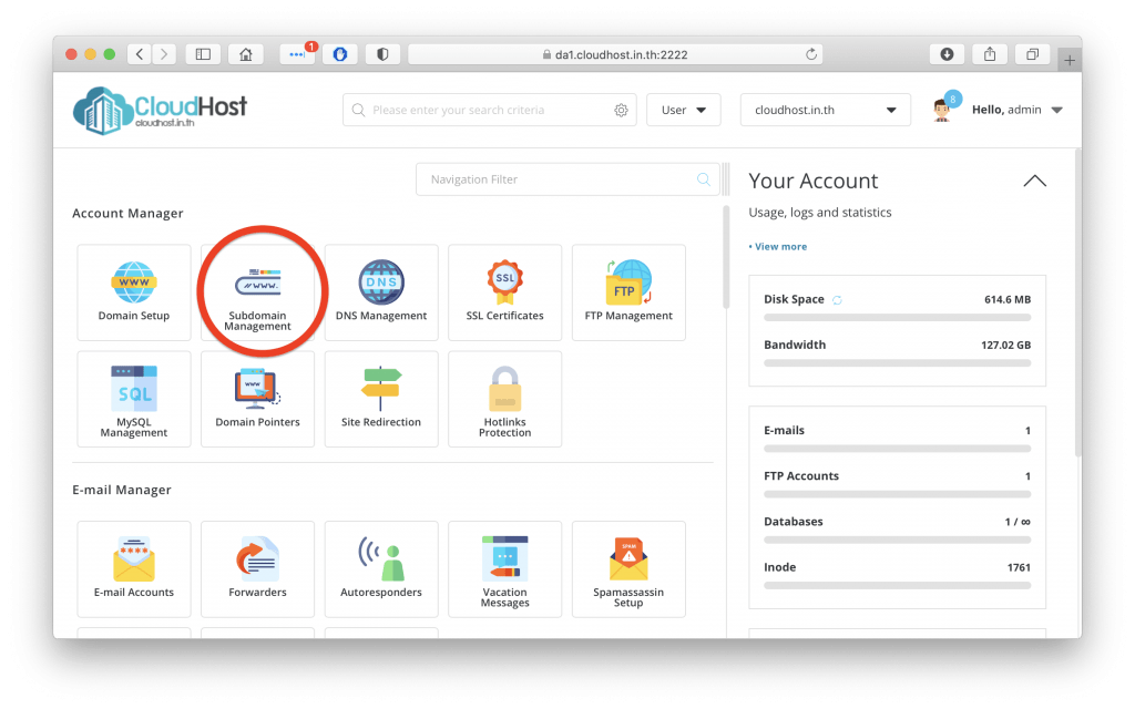 เมื่อเราต้องการลบ Sub Domain ออกจากระบบ สามารถจัดการซับโดเมนได้ที่เมนู Subdomain Management นะครับ