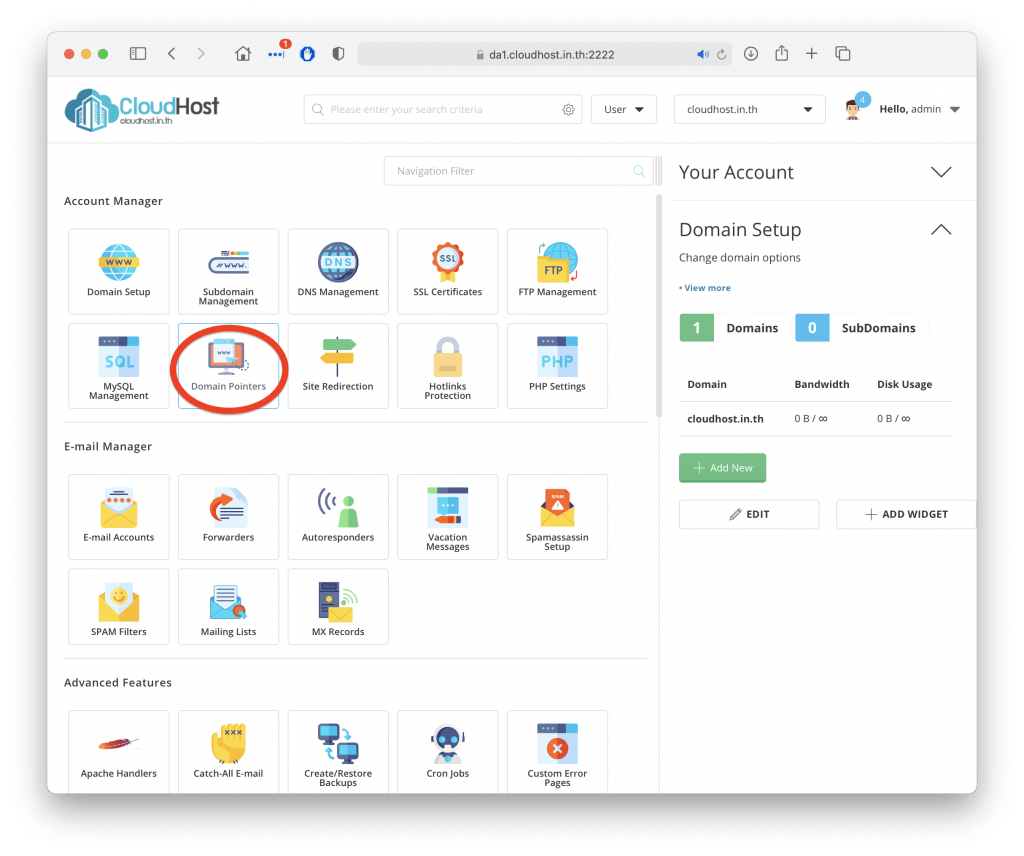 การทำ Domain Pointer หรืออีกชื่อคือ Mapping Domain เพื่อให้โดเมนชี้มาที่ Domain ที่มีอยู่แล้วในระบบ จะเป็นการชี้ Sub Domain มาที่ Domain หลักก็ได้ เช่น การทำ Sub Domain เป็นระบบ CDN โดยมีชื่อว่า cdn.domain.ltd แบบนี้ก็ได้เช่นกัน